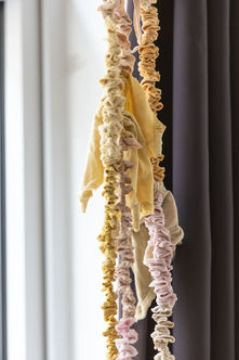 Experimenting with materials, I also transformed hundreds of discarded white t-shirts into hand-dyed textiles, using natural colorants made from food scraps and donated flowers from Karakara Blooms. One installation, FORGET ME NOW, presented a “cell phone nest” that challenged audiences to reflect on their dependence on digital devices and consider what it means to truly “untether.” The each bags were bundle dyed together with Denver community as an open workshop.